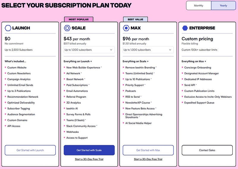 Beehiiv has various pricing tiers. They do have a free subscription plan for newsletters up to 2,500 subscribers. But if you want to offer paid subscriptions to your audience, you will have to upgrade to a paid plan.