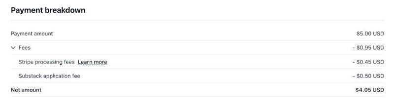 Substack makes its money by taking 10% of each transaction from paid subscriptions. This is in addition to the credit card processing and billing fees with Stripe. Here’s what a breakdown of those fees could look like.