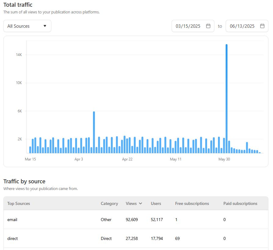 If you’re content with a surface-level look at your analytics, Substack will give you everything you need. Substack will give you the basics of total views, where those views came from, and how many people subscribed.